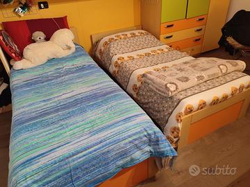 Vendo cameretta armadio lungh. 3,85 mt x prof. 60 cm + con 2 letti singoli con doghe in legno + scrivania con secondo tavolo estraibile e cassetti laterali, misura piano scrivania 1,45 mt + libreria alta 2,30 mt. Smontaggio e trasporto a carico dell'acquirente. Brugherio, secondo piano.