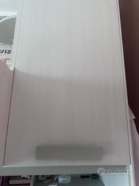 Ante battenti e frontali cassetti realizzati in pannelli di agglomerato di legno spessore 1,8 cm in finitura Betulla e particolari in colore corda.