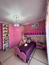 Vendo cameretta completa della Moretti. Composta da doppio letto songolo a castello ( materassi ortopedici inclusi), cabina armadio ad angolo, mensole libreria, con ripiani dietro mensole, chiuso da anta a scomparsa, scrivania, mensola sopra scrivania, sedia e comodino. Non e inclusa nella vendita la scarpiera (viola) che si vede in foto accanto la scrivania.