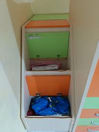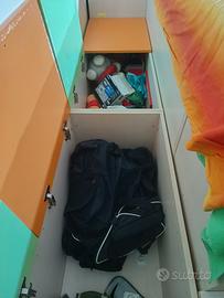 cameretta 2 posti sempre pronti+1 retraibile completa di cassettoni porta oggetti e mensole misure 380×145×H260. Ha qualche segno di usura ma in condizioni generali buone. Visionabile su appuntamento