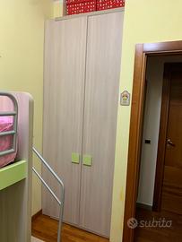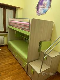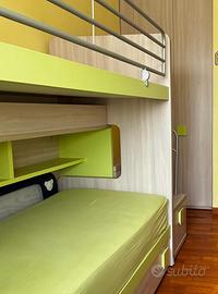 Vendo cameretta completa Moretti compact di colore ambra con maniglie verde germoglio, caratterizzata da una soluzione salvaspazio con letto a ponte su sistema scorrevole di apertura/chiusura. Composizione: letto superiore a ponte, letto inferiore con due ampi cassettoni estraibili; scaletta laterale per accesso al letto superiore con contenitori; mensole di appoggio; armadio con ripiani ed appendiabiti. Smontaggio e trasporto a carico dell'acquirente