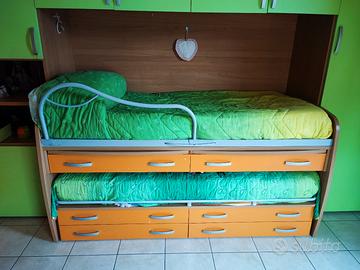 Cameretta completa dotata di doppio letto (il secondo estraibile), armadio a ponte molto capiente, 1 scrivania ampia + 2 estraibili, 1 libreria con 4 cassetti, 2 mensole spaziose. È inclusa la scaletta per salire sul letto superiore.