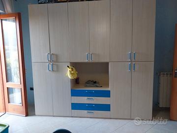 cameretta usata poche volte vendo per cambio casa.Armadio con ante ,2 comodini,2 scrivanie, 4 mensole,1 rete e 2 letti .Misura armadio 260 altezza,55 profondità.,273 lunghezza con 4 cassetti. smontaggio e trasporto a carico dell acquirente
