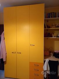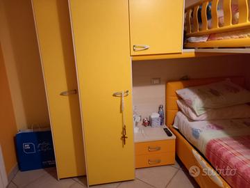 cameretta moretti compact struttura colore legno naturale con ante armadio giallo e arancio. Due letti singoli, quello al piano inferiore si tratta di un letto contenitore con rivestimento in ecopelle ( un po usurato). Nel prezzo sono compresi 2 materassi singoli e anche il lampadario . Solo per chi è davvero interessato, no perditempo