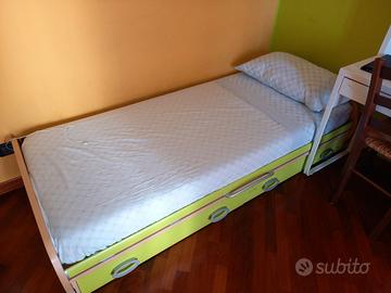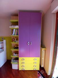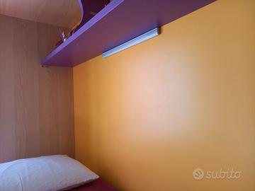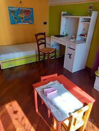 Camera per bambini Moretti Compact, made in Italy, composta da n°1 letto con n°4 ante superiori, n°2 ante laterali e casetti, larghezza max 3.1 mt + armadio separato con doppie ante, cassetti e scarpiera laterale sinistra larghezza 1.45 mt. Secondo letto impilabile al di sotto del primo o/e spostabile al bisogno tramite relative ruote con fermo. Luce a led touch a sfioramento + scrivania ikea + mini tavolino e 2 seggiolini, casetti che si richiudono con accompagnamento meccanico, Ottime condizioni. Pagata nuova a 3500 euro