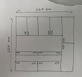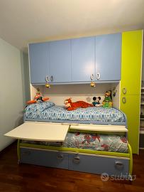 Cameretta Moretti, con due letti, due scrittoi estraibili. Ottime condizioni presenta solo alcuni piccoli segni di usura. Altezza 258 cm. Larghezza 250 cm. Misure letto 200x100. Maniglia per estrarre il letto inferiore con comode ruote. Disponibile piccola scala per accedere al letto superiore e barriera anticaduta letto superiore. Ritiro zona Acilia Roma