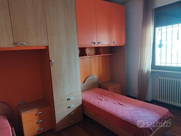 Camera completa nota marca Moretti Compact in ottime condizioni. Finiture tinta legno e arancione con maniglie argentate. Camera compresa di armadio ampio, due letti singoli, due comodini e scrivania con mensole abbinate. Misure camera circa H260xL370xL255. Misure scrivania H77.5xL100xP80