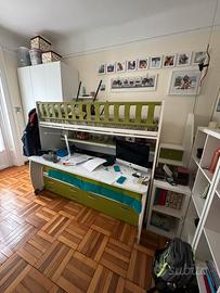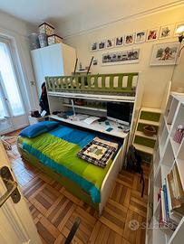 Vendo cameretta completa Moretti Compact, caratterizzata da una soluzione salvaspazio con letto a ponte. Composizione: •Letto superiore a ponte •Letto inferiore con ampi cassettoni estraibili, ideali per contenere biancheria e oggetti •Scrivania estraibile, pratica e funzionale per studio o lavoro •Ripiano libreria sopra la scrivania •Scaletta laterale per accesso al letto superiore •Scaletta dotata di mobiletti contenitori con apertura frontale integrata •Materassi inclusi Caratteristiche: •Colore: bianco e verde (come da foto) •Struttura solida e di qualità •Condizioni: ottime, usata con cura •Soluzione ideale per ottimizzare gli spazi in camerette di dimensioni contenute Disponibile per visione. Smontaggio e trasporto a carico dell’acquirente.