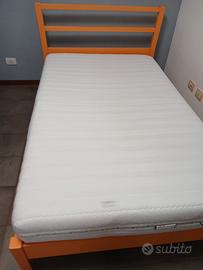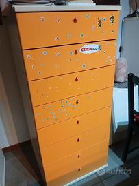 cameretta Moretti completa di armadio con appendiabiti, ripiani, 2 cassetti interni e ante scorrevoli in vetro colorato di dimensione 180x230 , comodino, letto una piazza e mezza con doghe, materasso e cassettiera.
