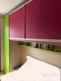 Vendo cameretta a ponte ad angolo firmata Moretti Compact, dotata di cabina armadio. La struttura è interamente in legno di alta qualità, di colore verde, e si presenta in ottime condizioni.