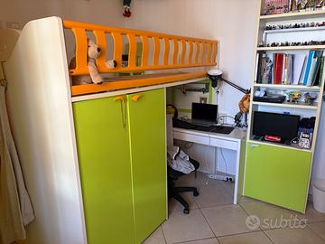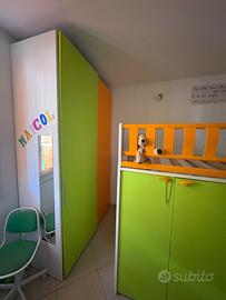 Vendo Cameretta Moretticompact in ottimo stato .composta da letto a soppalco con armadio,scaletta per salire sul letto con casetti e contenitore ,armadio con ante scorrevoli, libreria con anta.