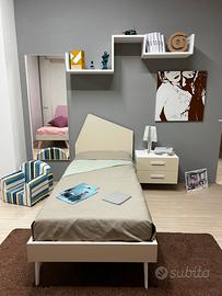 Armadio scorrevole L.235cm H.260cm, letto singolo 90cm X 207cm (Rete 80cm X 200cm) compreso di rete (materasso escluso), comodino 2 cassetti sospeso L.60cm, libreria sospesa FLEXO, specchio verticale.