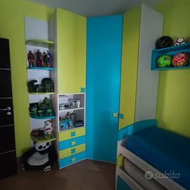 Vendo bellissima cameretta colore ciano e pera dotati di due letti uno a cassetto,più grande armadio angolare e mensole a cubi sia sulla parete del letto e sia sulla parete opposta.I colori si alternano in maniera equa.Riporto le misure armadio ad angolo 2 x 1,4 MT altezza 2,6 più letti da 2 metri e un ripiano a cubi di 2 MT per 40 cm più un altra da 1,6 metri per 40 cm più un lato da 80 cm.Ovbiamenti i ripiani possono essere montati anche in maniera singola o come lo si desiderano.Prodotto di ottima qualità spessore porte 2,5 cm mentre testata letto 3,5 cm.Per qualsiasi informazione lascio mio recapito telefonico 3389089048 Davide