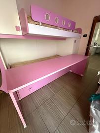 Cameretta completa a ponte con doppio letto, scrivania e armadi – colore bianco e rosa