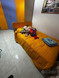 Cameretta per bambino colore blu e arancio, Letto 1/2 piazza compreso di materasso, armadio più cabina armadio angolare con cassettiera interna, comodino , cassettiera con rotelle per scrivania, mensole a cubo