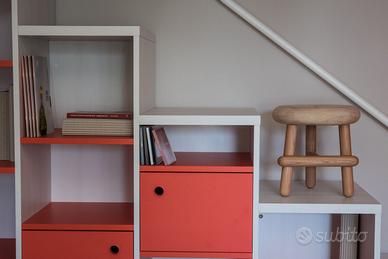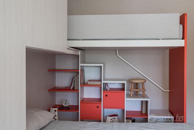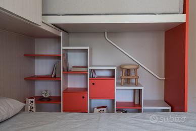 Composizione cameretta Nidi in laminato finiture Olmo chiaro e Pomodoro con letto a terra e letto soppalcato + armadio a ponte. Esclusi materassi