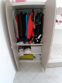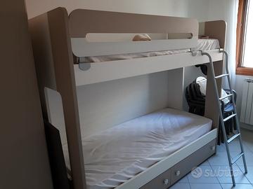 Trattasi di camera nuova, molto bella con letto a castello usato per una settimana da 2 bambine. Molto fine l'accostamento del tortora con parti color beige chiaro come da foto. Misure armadio larghezza cm 90, profondità cm 61, altezza cm 195 - letto a castello con 2 cassettoni largo cm 202, profondità cm 87, altezza cm 179, 2 cassettoni di larghezza intera cm 89, profondità cm 67 e altezza cm 15, materassi 194x80 e scaletta come da foto. protezione letto superiore molto bella. Decisamente l'effetto è di leggerezza. Parte posteriore del letto beige chiaro. Pomoli a forma di fiore. Consegna smontaggio e ritiro a carico acquirente. La cameretta si trova a Jesolo (VE).