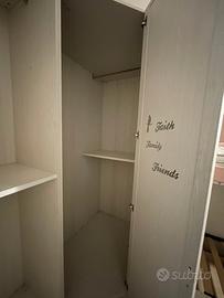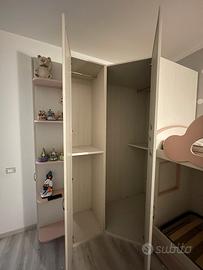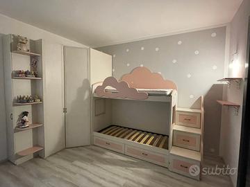 Vendesi bellissima cameretta per bambina/ragazza, completa e funzionale, caratterizzata da un design dolce e moderno con dettagli a forma di nuvola. La struttura è solida, in ottime condizioni e ideale per ottimizzare lo spazio in stanze di medie dimensioni. Il set include: Letto a Soppalco: Struttura robusta con protezione anticaduta a forma di nuvola rosa. Rete a doghe inclusa per il letto inferiore (spazio utilizzabile come secondo letto o zona gioco/relax). Scaletta Contenitore: Comoda scaletta laterale per accedere al letto superiore, dove ogni gradino è un pratico cassettone spazioso per riporre giochi o biancheria. Armadiatura Angolare: Ampio armadio capiente con ante a battente. Interni attrezzati con ripiani e bastoni appendiabiti (come da foto). Finitura effetto legno bianco venato. Cassetti Inferiori: Due ampi cassettoni estraibili sotto il letto inferiore per massimizzare lo spazio. smontaggio a carico dell' acquirente
