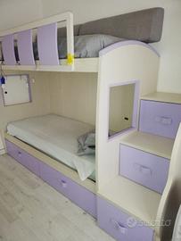Vendo cameretta composta da 2 letti. Il letto superiore completo di rete, materasso e 2 cuscini e scaletta di accesso con 3 cassetti. Letto inferiore completo di rete e base con 2 cassetti, misure m 255x100. Armadio 2 ante con cassettiera h 260x100 cm