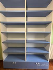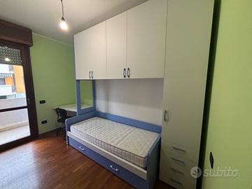 Armadio a ponte, letto con secondo letto, scrivania, libreria.