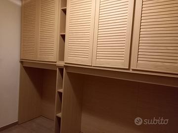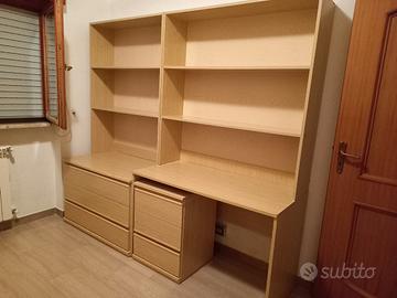 Cameretta colore legno chiaro con cassettiera, libreria, armadio e spazio per due letti singoli