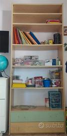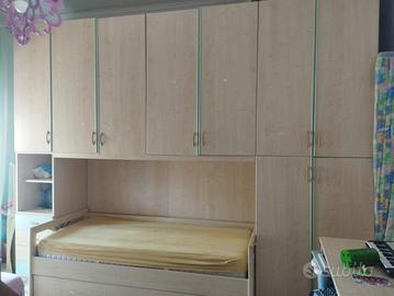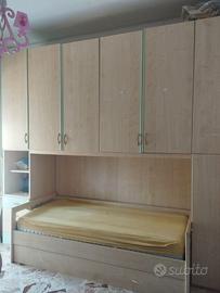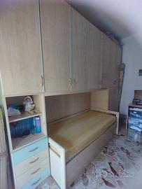 Cameretta con doppio letto , scrivania e libreria, compresi cuscini per rendere letto come un divano, letto superiore con doghe in legno ma senza materasso, letto a scomparsa con rete a molle e materasso compreso. A parte qualche maniglia da cambiare è in ottime condizioni. misure armadio 3.35 mt, scrivania 1,40 mt, libreria 0,95 mt. Ritiro e smontaggio a carico vostro entro fine agosto.