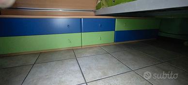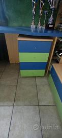 La cameretta è composta da due letti che scorrono su binari in alluminio fissati alla boiserie in laminato di faggio, due comodini pensili con cassetto, cassettiera bassa con comodo ripiano, una libreria, 4 cassetti grandi e due cassetti piccoli, cassettiera con ruote per spostamento con 4 cassetti medi e una spaziosa scrivania ergonomica, il tutto colore faggio con inserti in blu e verde chiaro