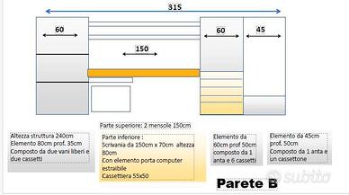 Elemento 60cm prof. 35cm Composto da due vani liberi e due cassetti; Parte superiore: 2 mensole 150cm ; Parte inferiore : Scrivania da 150cm x 70cm altezza 80cm Con elemento porta computer estraibile; Cassettiera 55x50