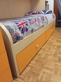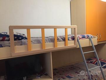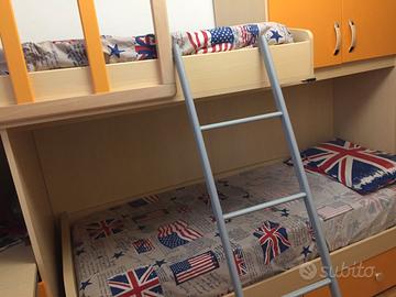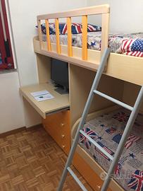 Vendo mobile cameretta carino e compatto per i vostri DUE bambini/ragazzi con letto a castello. Il mobile si estende su 3 metri di lunghezza (basta una sola parete!) ed include una cassettiera da 4 cassetti, un vano ad ante con appendiabiti, due cassettoni sotto-letto ad elevata capienza ed uno strategico scrittoio estraibile, perfetto per compiti e giochi.