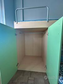 Cameretta verde per bambini con 3 posti letto (di cui 1 a scomparsa). 4 vani armadio di cui 3 con bastone appendiabiti, dotata di scaletta e sponda per letto superiore. 3 materassi inclusi nel prezzo. Cuscini NON compresi.