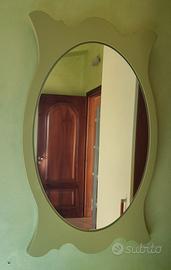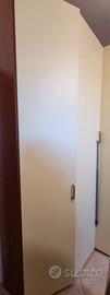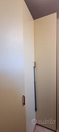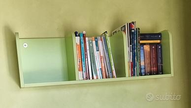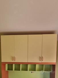 Cameretta per bambini colore noce verde pistacchio e giallo tenue composta da un ampio armadio angolare a 4 ante e con 4 cassetti, un ponte dove poter mettere un letto ( non è compreso) e nella parte superiore altri due armadi a 4 ante, un fila di scaffali per i libri, un mobile a 5 ripiani da usare come porta giocattoli o altro, una specchiera.