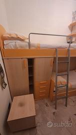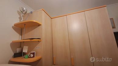 Cameretta ad angolo con 2 letti a castello con armadi + scrivania e scaffali.