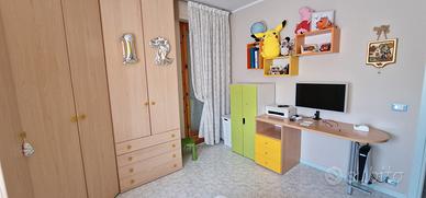 Vendo cameretta per bambini in ottime condizioni, composta da armadio con gabina, letto completo 200x90 comodino su ruote, ponte sopra letto e scrivania con mensole a cubo, struttura in color faggio e sportelli arancio gialli. Disponibile dalla dalla metà di luglio. Prezzo trattabile.