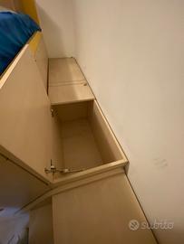 Camera con letti a ponte. Sotto letto con nr. 2 cassetti estraibili. Corridoio contenitore con tre cassetti contenitori sulla scala. Comodino. Cabina armadio. Scrivania e nr. 2 mensole. Ritiro a carico dell’acquirente. Prezzo trattabile