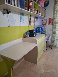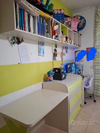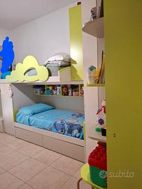 Cameretta acquistata da mondo camerette con due letti di cui uno a castello con scala con cassetti per salire,armadio ad angolo (cabina) scarpiera,due scrivanie,cassettiera esterna grande.si vende corredata di una sedia girevole e tenda