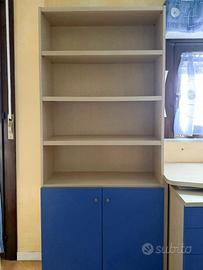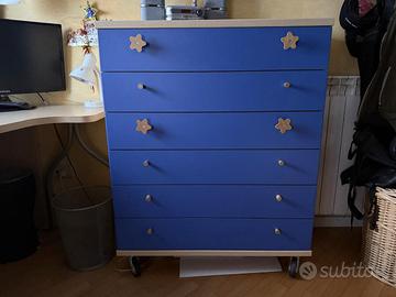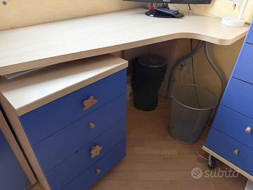 Tutti i mobili sono in legno chiaro con finiture blu, adatti sia per ragazzi che per bambini.