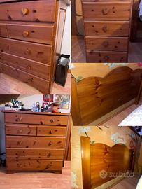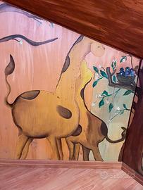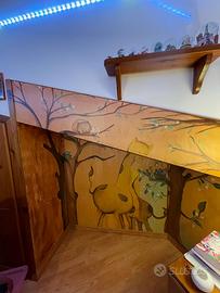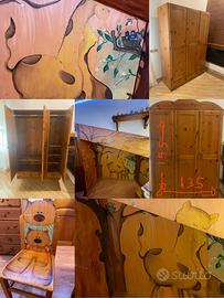 Vendo cameretta per bambini di legno massello, fatta da un artigiano che ha dipinto a mano i pannelli di compensato per le pareti, i mobili sono tutti in ottime condizioni e comprendono un como con cassetti ed anta ribaltabile, scrivania, cassettiera, sedia, comodini, testiera del letto, 2 applique, 2 mensole per libri, i pannelli per le pareti. Valuto vendite di pezzi singoli. No spedizione. Trattabile de visu.