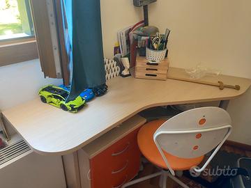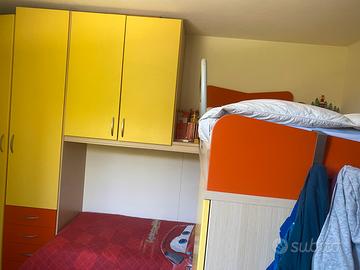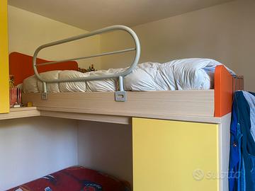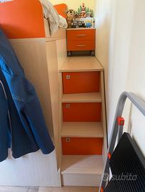 Cameretta per bambini con 2 letti ( si puo aggiungere un 3 letto ) dotato di scrivania ad angolo e 2 comodini. Le scale hanno 3 vani piu un vano nella parte alta. Per misure contattare in privato. Smontaggio e trasporto a cura del compratore