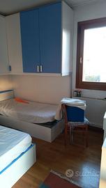 Vendo cameretta causa trasloco per bambini colore azzurro+ bianco , ad angolo mis. 2100x2600x2500 (L1xL2xH) , con armadio a ponte sospeso, cassettiera, con comodino centrale e scrivania, completa di letti con contenitore sotto materasso, materasso, tutta integra e quasi come nuova - 2 anni di vita - vera occasione.