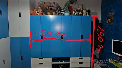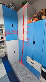 Cameretta per bambino, colore celeste e bianca con cassetti,pensili e armadio ad angolo.