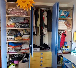 Cameretta Battistella colori giallo-blu-beige. In perfette condizioni, composta da: letto con letto aggiunto estraibile, libreria, 2 mensole, armadio 6 ante, scrivania, cassettiera a rotelle, sedia a rotelle, serie mensole "cubotti". Tutto come da foto allegate. La cameratta è un prodotto di alta qualità, astenersi perditempo.