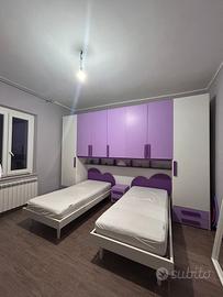 cameretta presa da moretti compact per una stanza 4×4 (16 m²), con due letti e i due materassi, armadio, scrivania e mensole (il tapis Roulant non é compreso) É senza graffi e tenuta bene.