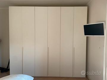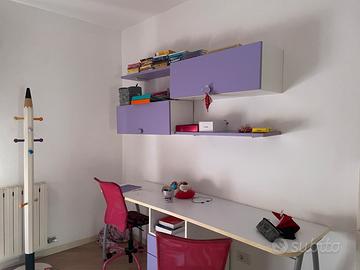 2 lettini, 2 comodini, vetrinetta, mobile contenitore, scrivania di 2 metri, 2 sedie regolabili in altezza con ruote, mensole e contenitore porta libri.