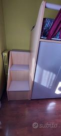 CAMERETTA A SOPPALCO colori larice e lilla con due letti sfalsati (privi di materassi), moduli armadio in alto e in basso e scaletta contenitore per accedere al letto superiore.