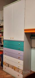 Cameretta per ragazzi acquistata nel 2000 da "Il Regno della Cameretta" di Lissone. Dotata di cabina armadio, 2 strutture a ponte, 2 scrivanie di cui una avente vano atto ad incassare un termosifone o un mobiletto a colonna. Ha 2 letti di cui 1 a scomparsa sotto il primo. Le misure dei moduli sono le seguenti: tutti sono profondi 60 a parte la libreria profonda 30 cm. Il modulo più piccolo è di 50 cmx60 dotato di anta appendiabiti+ 6 cassetti. Segue cabina armadio angolare la cui parte frontale misura 85 (all'interno ha mensole e 2 barre appendiabiti e faretti). I due ponti misurano 204 e ogni modulo sovrastante 100. La libreria, vetrina + mensole, misura 107x130x30 + 130 di parete fino a terra. Le scrivanie misurano 60x105 h. 73 e l'angolare con foro 90x107. L'ultimo modulo dotato di 8 cassetti grandi + guardaroba misura 100x60. L'altezza da terra del tutto è di 263 cm. Segnalo come difetti solo un cassetto grande il cui frontale sarebbe da rifare. I colori delle parti colorate sono verde acqua chiaro e scuro, arancio e lilla, A disposizione pomoli di scorta. Prezzo trattabile.