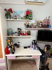 Cameretta composta da armadio componibile con scocca in laminato bianco, ante in ramino e impellecciatura rabble verniciata a specchio. Scrivania, comodino, mensole e letto in MDF laccato bianco e cassetti a tono. Misure: Armadio ad angolo Altezza:230cm Profondità:59cm Lunghezza singolo armadio:100cm Larghezza mensole:40cm Scrivania: 120*78cm Mensole:100*24cm Armadio:230*50*56cm Comodino:47*57,5cm Il tutto è acquistabile per 800€ insieme a letto singolo (come in foto) senza rete e materasso. Per informazioni contattare il numero 331-1306239 tramite whatsapp oppure direttamente sul portale di subito.