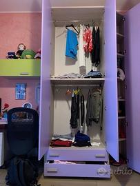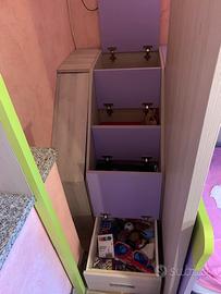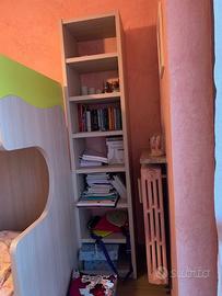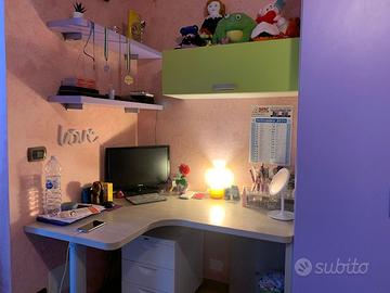 Cameretta per ragazzi con due letti a doghe (esclusi i materassi) di cui quello inferiore indipendente ed orientabile come si preferisce, completa di scaletta e passerella (per raggiungere letto superiore) con ante a scomparsa e ripostigli interni; comodino largo a due cassetti, armadio 2 ante + 3^ anta inclinata a 45 gradi; libreria, scrivania ad angolo con pensile e mensole varie.