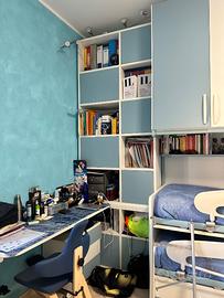 Vendo cameretta per ragazzi composta da due letti, quattro cassettoni sotto il letto inferiore, una cabina armadio, due scrivanie, due librerie, due cassettiere e armadio a ponte.