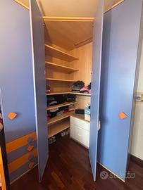 Armadio angolare con due ante da 60 cm, una con cassettiera a 4 cassetti, angolo (115*115) con ripiani e aste appendiabiti.