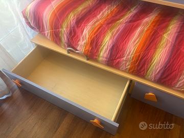 letto doppio (1,90 m): letto superiore con doghe in legno, letto inferiore con due cassettoni contenitori